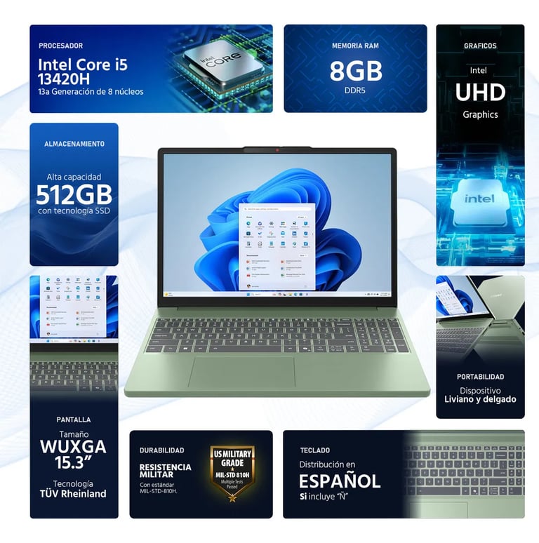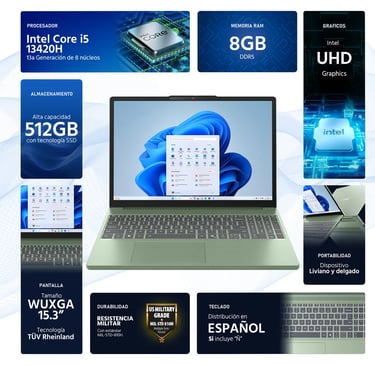 Entre sus especificaciones, este portátil cuenta con un procesador Intel Core que garantiza un rendimiento rápido y eficiente. Esto significa que puedes realizar múltiples tareas sin experimentar retrasos en el sistema. También incluye una buena cantidad de memoria RAM, lo cual es esencial para aplicaciones que requieren mayor capacidad de procesamiento.